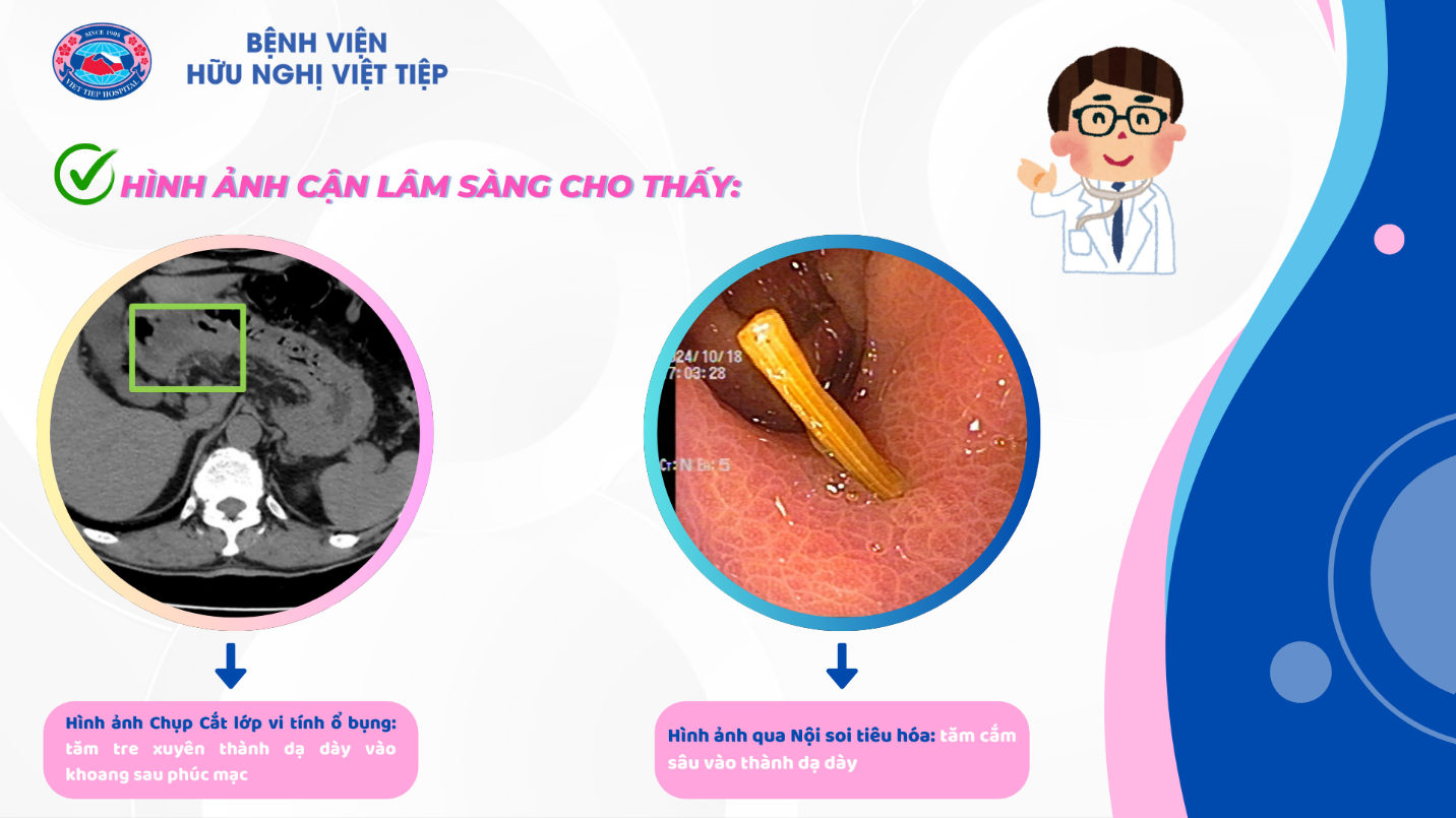 Người bệnh được chuyển đến Bệnh viện Hữu Nghị Việt Tiệp và nhập viện vào Khoa Nội tiêu hóa. Tại đây, người bệnh nhanh chóng được các bác sĩ thăm khám và chỉ định chụp Cắt lớp vi tính ổ bụng cho thấy hình ảnh: tăm tre xuyên thành dạ dày vào khoang sau phúc mạc.