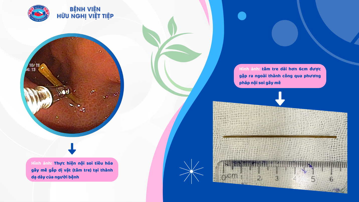 Kíp nội soi Khoa Nội tiêu hóa, Bệnh viện Hữu Nghị Việt Tiệp đã khẩn trương tiến hành nội soi gây mê và gắp thành công tăm tre ra ngoài an toàn, không có biến chứng viêm phúc mạc, người bệnh được xuất viện chỉ sau 6 ngày điều trị nội trú với tình trạng sức khỏe ổn định.