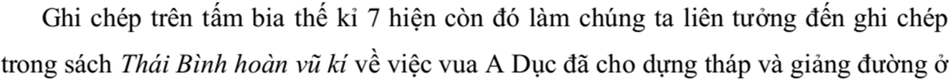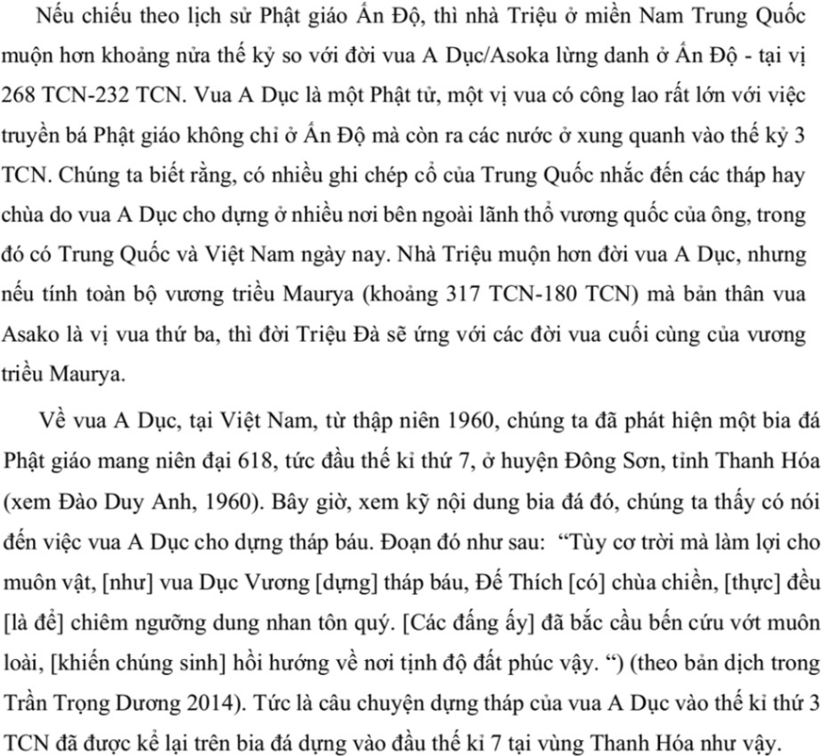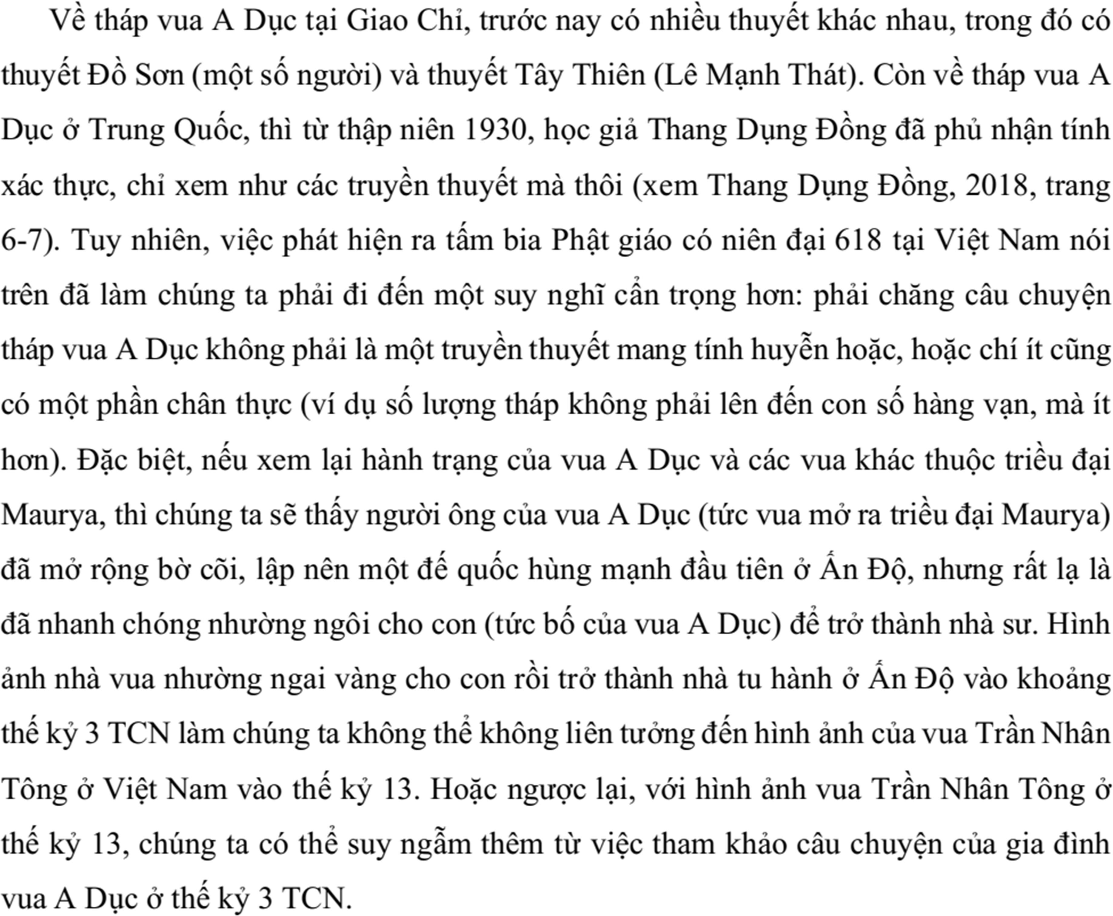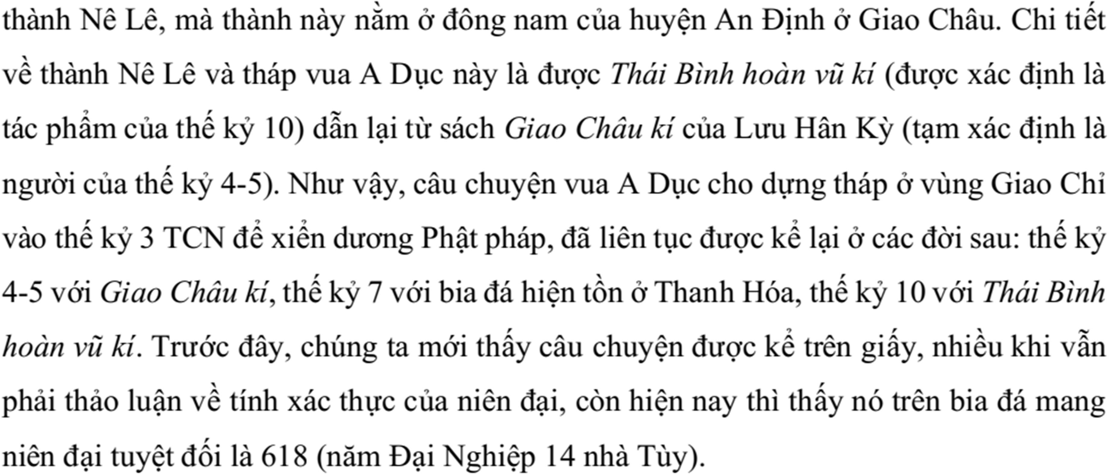 Qua nghiên cứu của tôi, các ghi chép về tháp A Dục (vua A Dục cử các đoàn truyền giáo từ Ấn Độ đi các nơi, và đánh dấu bằng các tháp, gọi là "tháp A Dục") tại Giao Châu xuất hiện trong Giao Châu kí (thế kỷ IV–V, được chép lại vào đời sau), văn bia năm 618 tại Thanh Hóa, và Thái Bình hoàn vũ kí (thế kỷ X).